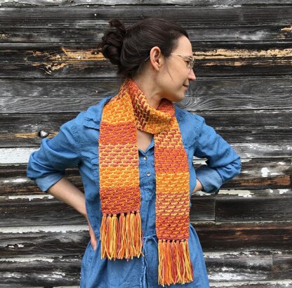 Two big knitting trends (mosaic knitting and skein kits) combine for a project that is sure to inspire you to cozy up in a scarf this season. The mosaic stitch pattern and color-shifting stripe arrangement make this an engaging knit with lots to look forward to—no dreaded “scarf boredom” here! Options included for adding fringe, or making as an infinity scarf.