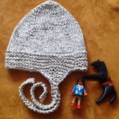 This pattern is recommended for beginners who want to work an easy knitted hat for the little ones. Because two cotton qualities are blended together the stitches are easy to handle and the stockinette and garter stitch pattern gives also a lot of fun. The hat is worked from top to down while the nice earflaps and the interesting tapes are worked on continuously.