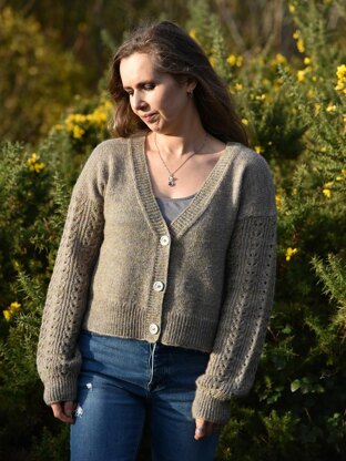 DESIGN OVERVIEW: Emmer Cardigan is knit seamless up to underarms with dropped shoulder and deep V-neck. The lacy balloon sleeves are balanced with body in stockinette stitch. Cropped length of cardigan allows to wear it with wide range of clothing. It can be easily adjusted by adding some length. Ribbed hem, sleeves’ cuffs and edge band are knitted with twisted rib. However, as per personal preference it can be replaced with classic 1 x 1 rib. Recommended positive ease 14-20 cm/5½ - 8 inches