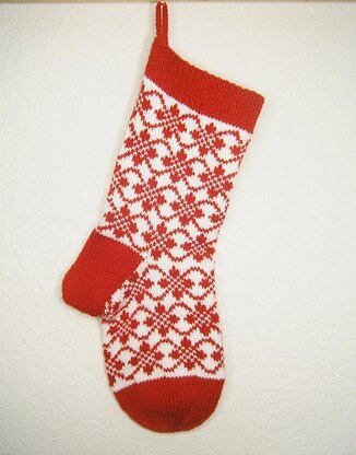 As the result of a trip to Norway, I was inspired by the beautiful designs that were used in the knitting from Selbu, the home of the now famous “Selbu Mittens”. The museum in Selbu, Norway has some wonderful pieces of knitting history. This Christmas stocking has borders of “endless roses”, a typical Norwegian motif used in hats, mittens, socks and sweaters. I saw many examples of these roses in the Selbu museum. Techniques used in this stocking are broken rib for the cuff at the top of the stocking, knitting with two colors at the same time, catching floats, working a flap heel with the decreases at the bottom as they were knit on some of the Bunad stockings from the traditional Norwegian national costumes, a round toe and an I-cord hanging loop. In worsted weight this is a generously sized stocking with a finished size of about 16 inches around and 23.5 inches top to toe. My sample is worked in a heavy worsted weight but a finer yarn could be used to make a smaller stocking.