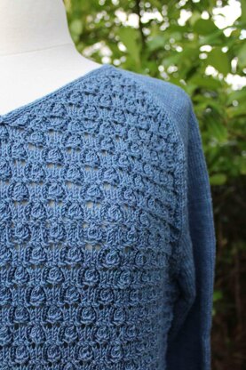 Engblommer is a pullover that can be worn with no ease or with positive ease. Engblommer has a nice texured all over lace pattern and the pullover is worked from the bottom edge and up. The pullover has long sleeves (the yoke is worket in one piece / raglan construction).