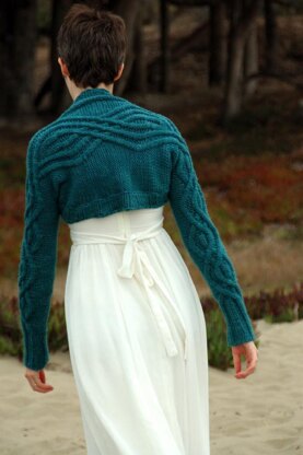 In ballet, entrechat describes a jump in which the dancer leaps straight upward, crossing his or her legs several times in the air. The cables in Entrechat are reminiscent of this beautiful movement, crossing and uncrossing from arm to arm. Knit flat in one piece and then seamed, this is an article that looks far more complicated and difficult than it actually is. Worked with chunky weight yarn, it knits up fast for a beautiful and sophisticated short winter coverup.