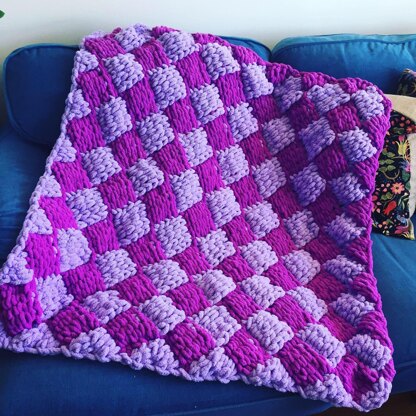 THIS IS A LOOP YARN FINGER-KNITTING PATTERN. The Amazing Entrelac Basket Weave Blanket is a diagonal checkerboard or diamond pattern with squares knit in opposing directions, which gives a basket weave look. This is not a quilt! These square are not sewn together afterward. Entrelac is a knitting technique that isachieved by knitting with a continuous strand of yarn. You will knit one string of horizontal squares at a time. This can be done with one colour, as in the photos, or if you choose, you can change colours for each row (there are lots of inspiring photo ideas if you google 'Entrelac').