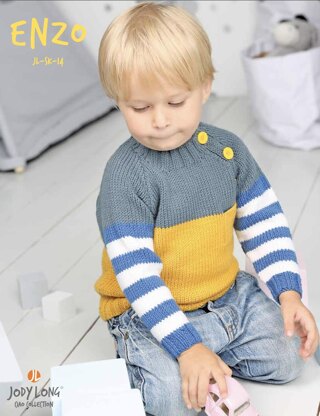 Enzo is a beautiful modern raglan featuring button detail along one of the raglan armholes. The sweater also features a pocket lining in a contracting colour. The pattern is available in sizes 0-11 years