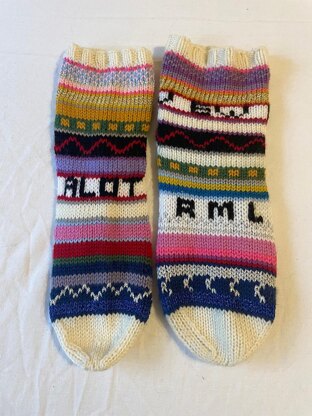 The socks are knitted from the cuff to the toes in the round. I use small circular needles, but you can use the magic loop method or DPNs based on your preference. The pattern goes through how to calculate the perfect foot length for your sock as well as optional modifications for the heel/gusset so that you sock fits well around the heel diagonal too. I have written and picture instructions for most techniques. Any DK yarn is suitable - the perfect project to use up your scraps! In the pattern I have listed the yarns I used and some suggested alternatives.
