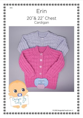 Erin is a unisex Baby Knitting Pattern for a beautiful cardigan. It is made using DK yarn with 3.25mm & 4mm needles and will fit a 20" and 22" chest (finished size) 150g of DK yarn required for each size.