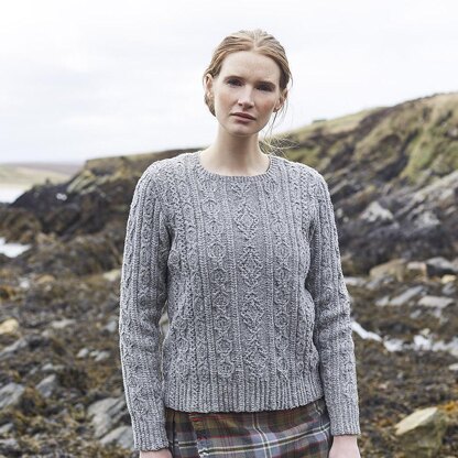 ERISKAY is a lovely all over stitch design using cabling and twisted stitch from the NORTH SEA collection.. It’s a great semi fitted sweater that will look good no matter what you wear it with. This design is knitted using Rowan’s Valley Tweed. It’s a 4 ply yarn with a soft woolly handle and is their replacement for Rowan Fine Tweed, which unfortunately was discontinued a few years ago. The garment is knitted in Malham 101 but of course can be knitted in any colour.