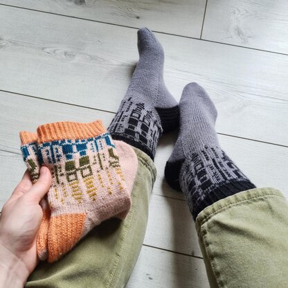 The Ersa socks are worked cuff down with two heels to choose from. They feature a geometric colourwork motif on the leg which can be worked in a variety of contrasting colours, from one to many leftovers.