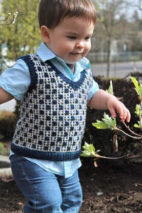 Slipped stitch colorwork gives this classic v-neck vest a fun overall pattern without the need to work flat stranded colorwork or a steek. This is an excellent pattern for tonal or variegated yarns—pair with a light neutral contrasting color for best results. Perfect for all your little one's escapades!