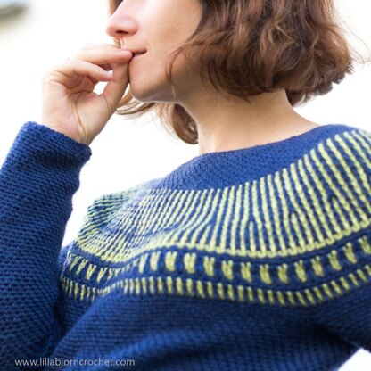Esja Sweater is worked seamlessly from top down. First the yoke is worked in rounds, then some short-rows are worked back and forth to create a higher back and then the crocheted pieces are separated for body and sleeves. The lower body is worked in rounds to hem. Sleeves are worked top down to the cuffs. The length of the body and sleeves is easily adjustable.