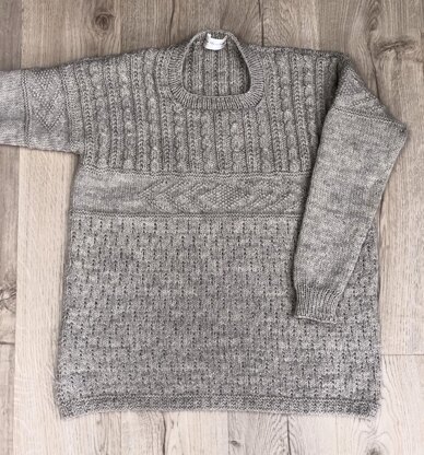 This handsome sweater features traditional gansey-inspired details. The main body is worked in an easy textured alternating stitch. A striking central band of chevrons framing a diamond motif is bordered by garter ridges and echoed on the top-down sleeves. The yoke adds interest with mock cables and textured ribbing, blending classic and modern elements. Designed for comfort and style, it is worked bottom-up and with full written instructions.