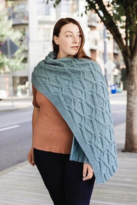 Esker is constructed in two halves and joined together using a 3 Needle Bind Off. The rib, at each end, leads gently into the cable pattern to give a seamless transition. There is a panel of moss stitch at the beginning and end of each row.