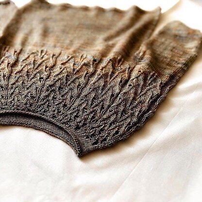 “Etude” is a pullover with an undulating lace pattern on the yoke, A-line body and slightly oversized sleeves.