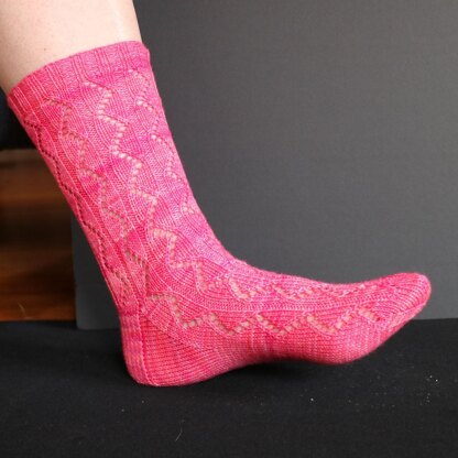 These socks have a moving eyelet pattern set in panels of stocking stitch separated by purl stitches. The pattern extends around the leg and continues down the front of the foot. When the sock is worn, the lace detail stretches out over the leg and foot; it is very eye-catching and pretty. These socks look great knitted in a solid colour, a speckle or a colour fade, so grab a skein and get knitting!!