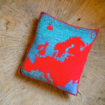 Pillow cover consists of two squares, one with map and one with continent name, both made using single crochet stitch throughout.