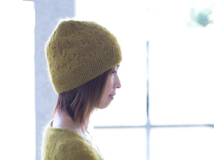 A lightweight hat matching Evening Dew cardigan. It is worked from the bottom up with 2 yarns held together.