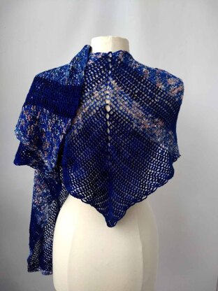 This stole begins with a center diamond and continues with two matching wings. The resulting shape is a right-angle shaped stole. To wear, it’s easiest to flip the piece so the top of the diamond is at the bottom and the two wings wrap around your shoulders.