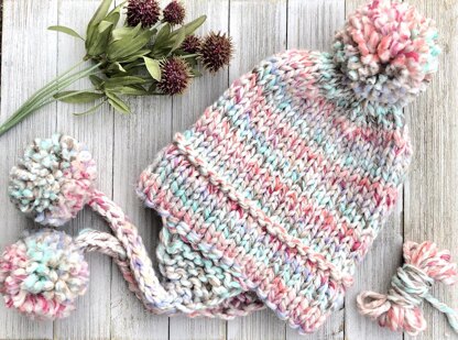 Knit in super bulky yarn, this cozy hat features a double brim, ear flaps, and pom poms. It’s sure to keep you and your loved ones toasty and warm this winter! Don’t be intimidated by the double brim. It’s easier to knit than you might think. If you are able to pick up stitches and knit two stitches together, then you can knit this hat!