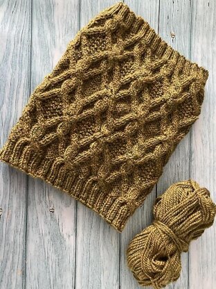 The Evergreen Cable Cowl features entwined cables with diamonds and rope cables. The diamonds are either filled with a texture pattern or reverse stocking stitch. Knitted in DK or Worsted yarn to match our gauge/tension.