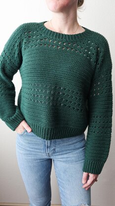 This cozy crochet sweater is perfect for a chill afternoon running errands or hanging at the local coffee shop. It features a relaxed cropped fit, straight sleeves, and a subtle eyelet striped texture. This pattern was inspired by the evergreen trees found near my home in Minnesota. It can also double as a low-key and stylish Christmas and holiday sweater.