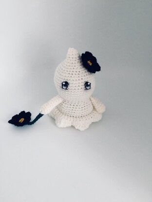 Meet Everly the ghost a new series for PoseyplacebyDenise Follow her beyond the flower garden... Gauge: use a small enough hook so your stitches are tight. Usually this means a hook several times smaller than recommended. Size is approximately 4 inches depending on hook and yarn used. Materials needed Knitpicks palette in white, small amounts in black, yellow and green Yarn needle Safety eyes approximately 6 mm Stitch marker Fiberfill Small piece of cardboard Optional fabric paint and glue