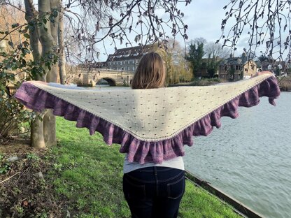 Get your flirt on with this fanciful shawl inspired by the ruffled and frilled fashions of the 80’s. Worked in two sections, the body is knit from side to side with eyelets winking playfully amidst the smooth stockinette. Stitches are then picked up along the edge of the crescent, with increases worked to build up a dramatic ruffle. To get the right amount of flounce, the border section is worked with larger needles to create an air of fancy free, breezy stitches full of airiness and drape. A video tutorial on how to join the ruffled border is linked in the pattern.