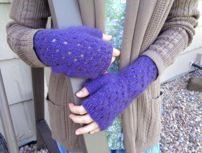 The combination of purple, a delicious possum-blend yarn, and cute little eyelets make these fingerless gloves a treat to knit and better to wear!