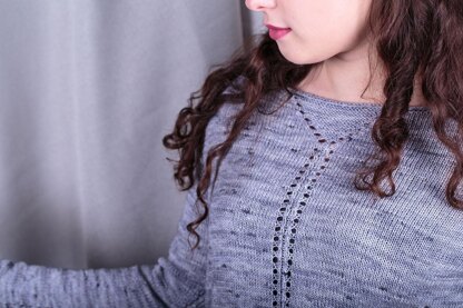“Eyeletta” is a loosely fitting everyday sweater with a stretching eyelet pattern down the front and back. Worked top down seamlessly, with neckline and bottom shaping featuring German short rows, it requires almost no finishing at all, except for weaving in ends and an optional slight blocking to open up the eyelet columns. Perfect for first-time lace knitters with basic garment experience!