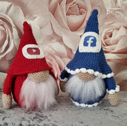 We would like to introduce to you 'The Social Gnomes' here we have the Facebook and YouTube Gnomes, they are both made in basic stitches and rounds, written in U.S Terminology and stand at approximately 10" in height,
