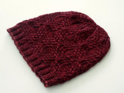 Textured diamonds add interest to this unisex cap, worked in rich jewel-tones. Both written and charted instructions are provided. Sample measures 18" around, 8" long; it stretches to 22 inches. For a slightly smaller hat, go down one needle size.
