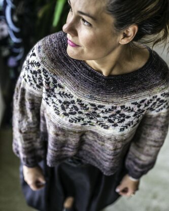 The Winter to Summer Sweater is knitted top-down, with a slightly oversized drape in body and sleeves. It has two fades: upper one (the small fade) and lower one (the big fade) and a colorwork - meaning you will need a couple of fading colors and one contrast color of the same palette, or combine the lightest and the darkest fade color in a colorwork. You can also do a reverse fade, or two different fades up and down. Have fun!