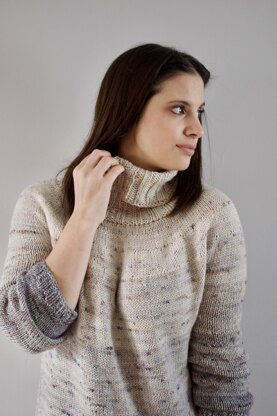 This sweater is knit seamlessly top-down and includes approximately 6-8 inches / 15.2-20.3 cm of positive ease. The collar is picked up after you complete the body. When selecting your size, consult the finished measurements to choose the one closest to your actual size with your desired ease.