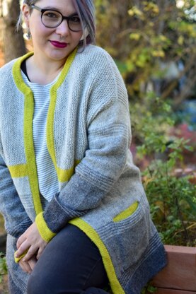 FadeOut is a casual open-front cardigan knit sideways and top-down, with contrasting afterthought pockets and folded edges all around.