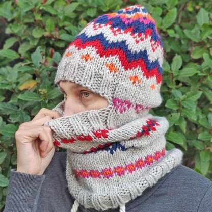 Balaclava is worked in a round featuring different fair isle colorwork. 2x2 ribbing included for the bottom hem and face opening.