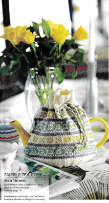This is a pattern for a Fair Isle Tea Cosy, originaly published in Knitting magazine. It has a simple small scale Fair Isle pattern and 2 x 2 rib edges. Plaited tie and eyelets. Photos Knitting magazine.