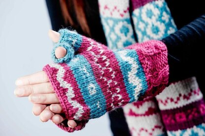 These little wrist cuffs will keep you lovely and warm whilst leaving your fingers free. They are knitted in a simple fair-isle and they complement the scarf, snood and hat to mix and match your own accessories.