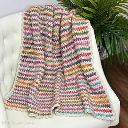 Play with random stripes and color changes—no ends to weave in! Just carry the yarn up the sides and hide it with the neat border. Reversible, warm, and pretty, it’s perfect as a throw or a thoughtful handmade gift.