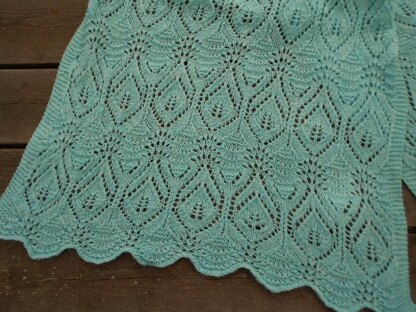 Wrap yourself in this fairy-leafed shawl that you can knit in any weight yarn! The pattern features leafy, lace motifs that seem to be floating on the waves! It is knit from the bottom up in halves, then, joined with the kitchener Stitch in the center. Worked in a lovely, watery color, or your choice of color, it looks fairy-like in fingering weight yarn! It is delicate, yet warm and sturdy! There are written as well as charted instructions to knit this deceptively easy shawl!