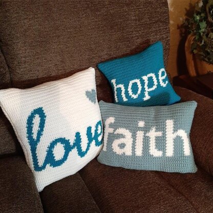 Pattern includes instruction and tips for how to do intarsia crochet, specific instructions for THIS particular pattern and a colored graph. "I Love This Yarn" brand yarn was used for this pattern, however any medium weight (#4) worsted weight yarn with comparable colors can be used. Front of the pillows have the word graphics, the back is the solid main colors of White (Love), Sea Blue (Faith), Peacock (Hope).