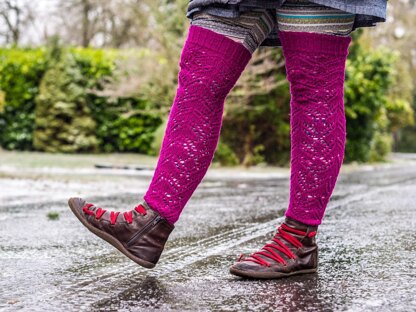 Notions: Tapestry needle. Skill level: Advanced beginner (knitting in the round, lace). Size/Finished measurements: For both sizes, height varies depending on how tall you want them. Small/medium: 8" lower cuff circumference, 13" upper cuff circumference. (Large/XL): 9.5" lower cuff circumference, 14.5" upper cuff circumference. Measured after blocking.