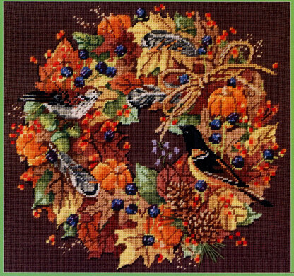 By Nancy Rossi. The perfect depiction of fall in this wonderful wreath of fall foliage, leaves, raffia, birds and feathers captures the crisp feeling of breezy and cool autumn weather leading to winter fun. This beautiful design by Nancy Rossi is elegant and timeless.
