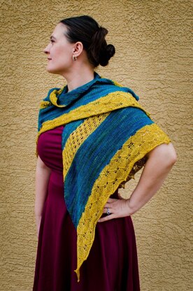Shawl is working from the top-down in typical triangular shawl construction. Panels of Stockinette balance 3 lace panels that are worked in a contrasting color.