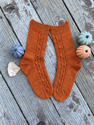 This pattern is all about fall and pumpkins! The sock has a cabled pumpkin motif that runs up the outside of the front of the foot/leg. It is placed on opposite sides, so the pattern is written for a left sock and a right sock.