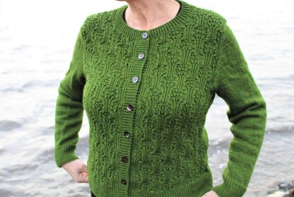 Fane is a cardigan worked from the bottom edge and up with a nice structured/lace pattern at the front of the body. The cardigan has long set in sleeves (the yoke is worket in one piece / raglan construction).