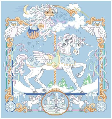 Designed by: Linda Gillum. Take a whimsical ride as you stitch this old-fashioned carousel horse. One in our classic series of carousel horses. This wintery design, filled with castles, unicorns, owls and the north wind, makes a great addition to any collection, and is sure to ignite fun childhood memories and imaginative daydreams.\n