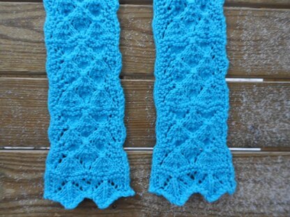 Yarn: 360 yards/330meters worsted weight. Sample scarf was knitted using 1 skein Red Heart Super Saver Jumbo Yarn (14oz/396gram); 744yds /681m 100% Acrylic; in color—Turqua.