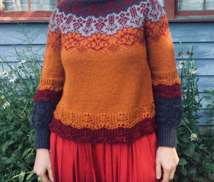 The pullover has a simple top-down construction, with German Short rows and Colorwork yoke, followed by a solid stockinette body, and finished with two color lace border. The body is a slightly A-line shape, fitted at the bust, and relaxed at the hem. Sleeves are knitted top-down, featuring solid stockinette to the elbow, transitioning to a multi-colored lace, with slightly ballooned shape. The color changes create the illusion of layers, making the best use of the yarns used in the Colorwork yoke, but can also be executed in a single color.