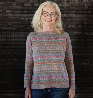 Faraway Fields is a boxy sweater that is worked from the top down. The front and back are worked separately after casting on using a provisional cast on. The collar ribbing is worked later, allowing for shoulder shaping whilst working upward. The shoulders are joined using backstitch and the body is knit in the round to the bottom. The sleeve stitches are picked up around the armhole for the sleeves.