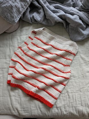 The top is knitted top down. First, the boat neck and shoulder area are worked in round. Followed by the back and the front part knitted flat separatly. The lower body part is knitted in round and finished by 1x1 ribbing. The edges are knitted in Seed Stitch Pattern. Contrast color stripes are used for the main fabric of the design.