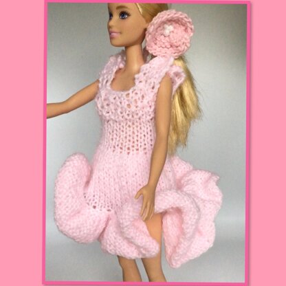 Shelly. loves wearing her party dress and all the mix and match outfits. Knitted flat, in 4ply cotton. Included are ruffled party dress, matching knickers, white jeans, pink top, shorts, bra top, striped skirt or tube dress, white jacket, kit bag to fit all the clothes in. There is also a pattern for knitted flowers to make hair tie or sew onto clothes and kit bag. Suits Paintbox yarn.